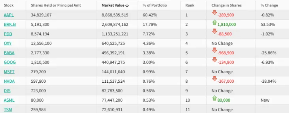 从整体持仓来看,H&H机构Q3的主要操作包括:大幅加仓伯克希尔B(+53.53%);减持苹果、拼多多、阿里、谷歌C、英伟达;对西方石油、微软、迪士尼和台积电持仓不变;新进阿斯麦。共计持有11只股票。