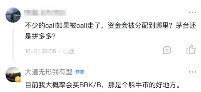 关于苹果的减持,有观点认为有可能是段卖call,给call走的。此前有网友向大道提问,问如果被call走了,资金会分配到哪里?段的回复是——大概率大概率会买BRK/B,那是个躲牛市的好地方。事后来看,操作也对应上了。