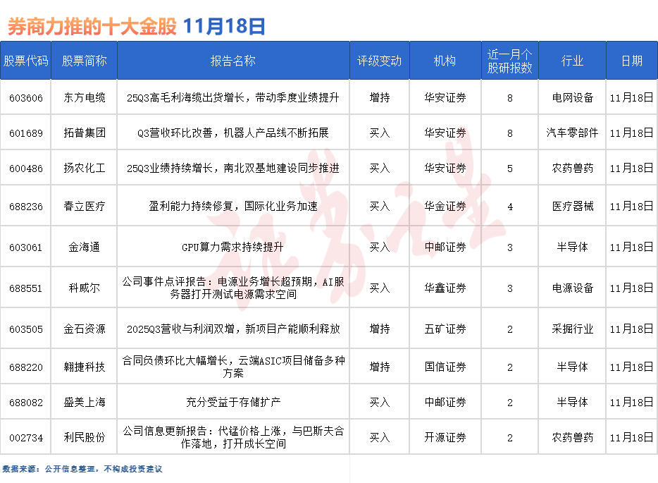 东方电缆最受券商关注,近一个月获中国银河、诚通证券、国信证券、华金证券、民生证券、东吴证券、国金证券等8份券商研报关注,位居11月18日券商力推股榜首。