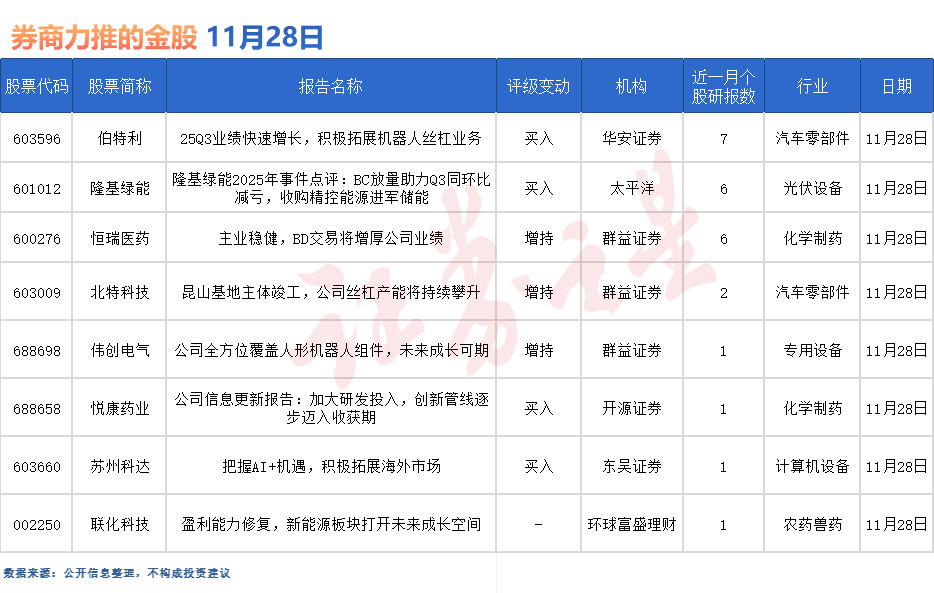 据证券之星数据库不完全统计,11月28日券商共给予近10家A股上市公司“买入”评级。从行业分布看,券商11月28日关注的个股聚焦于汽车零部件、光伏设备、化学制药、汽车零部件、专用设备、计算机设备、农药兽药等行业。
