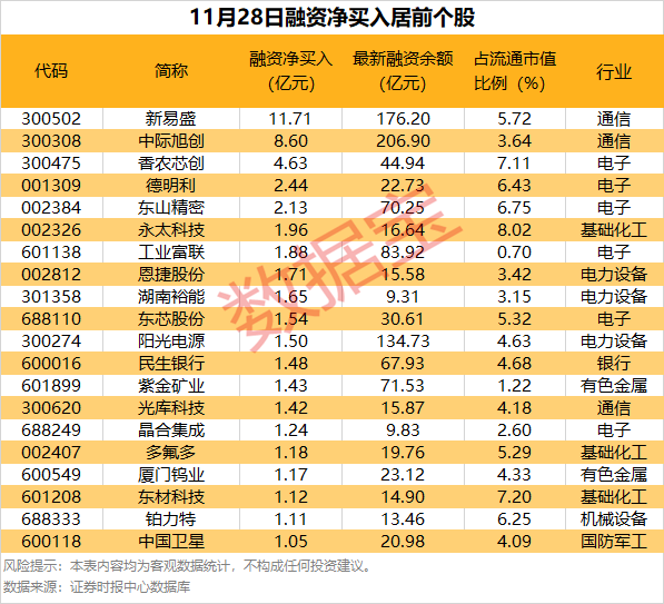 具体到个股,11月28日获融资净买入千万元以上的有387只,其中20只融资净买入额超1亿元。新易盛融资净买入额居首,当日净买入11.71亿元;其次是中际旭创、香农芯创,融资净买入金额分别为8.60亿元、4.63亿元,融资净买入金额居前的还有德明利、东山精密、永太科技等。