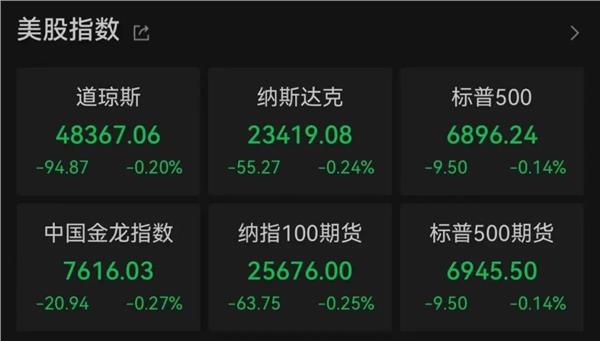 美东时间12月30日(周二),美股三大指数连续第三个交易日微幅收跌。截至收盘,标准普尔500指数下跌0.14%,纳斯达克综合指数下跌0.24%,道琼斯工业平均指数下跌0.20%。