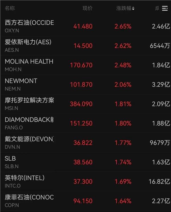 西方石油、DIAMONDBACK能源、戴文能源、康菲石油分别上涨2.65%、1.80%、1.77%、1.64%。