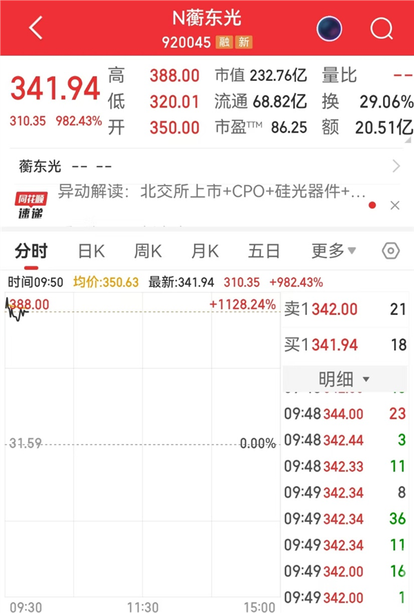 N蘅东光开盘价350元,涨幅一度达1007.95%。公司聚焦于光通信领域无源光器件产品的研发、制造与销售,主要业务板块包括无源光纤布线、无源内连光器件及相关配套业务三大板块,主要产品包括光纤连接器、光纤柔性线路产品、配线管理产品等光纤布线类产品以及多光纤并行无源内连光器件、PON光模块无源内连光器件等内连光器件类产品。