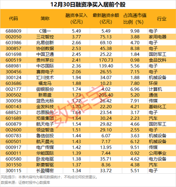 具体到个股,12月30日获融资净买入千万元以上的有508只,其中37只融资净买入额超亿元。C强一融资净买入额居首,当日净买入5.49亿元,其次是三花智控、兆易创新,融资净买入金额分别为3.77亿元、2.66亿元,融资净买入金额居前的还有协创数据、中国卫通、贵州茅台等。