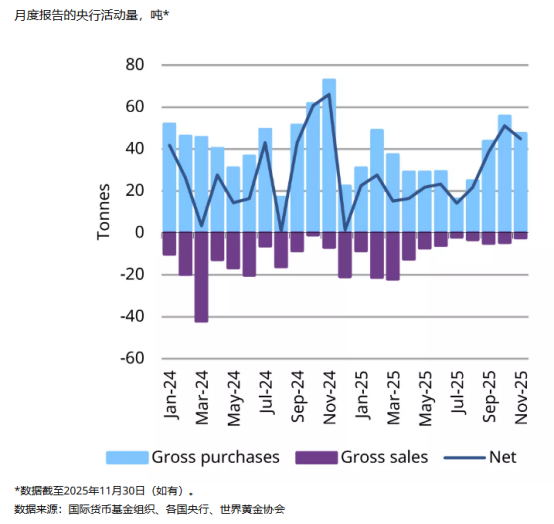 世界黄金协会最新数据显示,11月份各国央行对黄金的需求依然强劲。净购入量达45吨,虽然较10月份略有下降,但与今年前几个月相比,购入量仍处于较高水平。年初至今累计购入量接近297吨,新兴市场央行今年继续保持大规模黄金购入。摩根士丹利预计,到今年第四季度,金价可能飙升至每盎司4,800美元,理由是利率下降、美联储领导层变动以及央行和基金购买力度强劲。