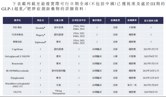 但这款核心产品尚未上市,就已面临白热化的市场竞争。全球范围内已有三款GLP-1药物获批超重/肥胖症适应症,另有七款候选药物处于三期临床阶段;国内市场更是群雄逐鹿,包括仁会的贝纳鲁肽、诺和诺德的司美格鲁肽、礼来的替尔泊肽和信达的玛仕度肽。此外,还有十余种同类在研药物处于三期临床试验及生物制品许可申请阶段。行业机构预测,到2029年国内可能有多达16种新的GLP-1类减重药物上市,赛道竞争将进一步加剧。