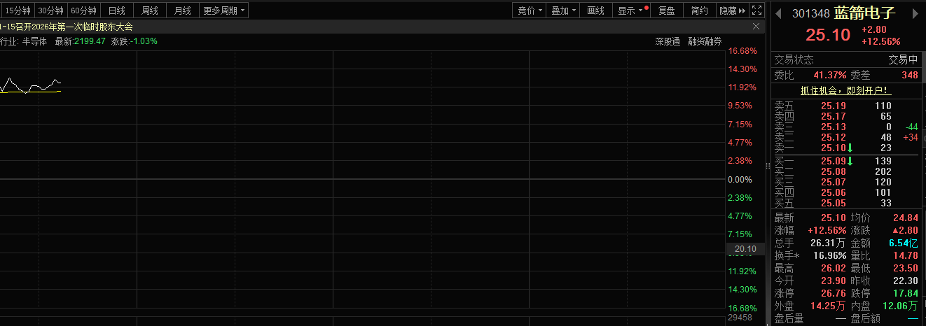 1月13日,蓝箭电子(301348)股价大涨,截至发稿,股价涨幅超12%。