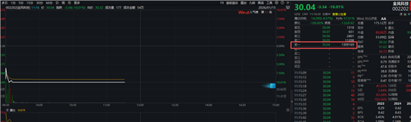 金风科技今天上午多数时间封住跌停,盘中卖一位置长时间出现约1.3亿股巨量卖单,相关卖单市值折合约39亿元。最近一段时间来,金风科技涨势凌厉,在一个月左右的时间里股价一度翻倍。
