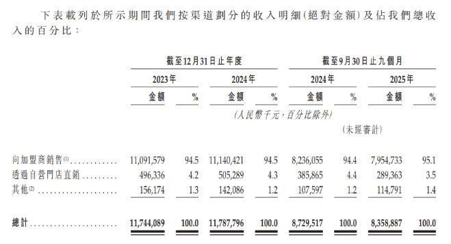 2023年及2024年,钱大妈营收规模连续稳定在百亿级别,分别为114.6亿元与114.9亿元。支撑这一规模的核心是其庞大的加盟网络。报告期各期(2023年、2024年及2025年1-9月),公司向超2800家加盟商销售商品所产生的收入,分别达到110.92亿元、111.4亿元和79.55亿元,各期占比均接近95%,构成了其收入的绝对支柱。