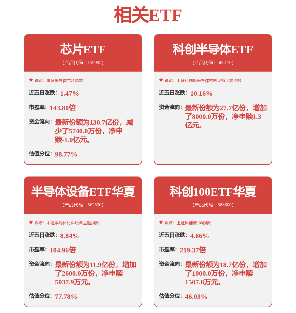 ETF 方面,科创半导体ETF(588170)收涨6.50%, 冲击3连涨。半导体设备ETF华夏(562590)收涨1.97%,冲击3连涨。