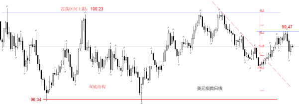 行情方面,美元指数仍在延续震荡走势,下限96.34~上限100.23,仍未被有效突破。最近一个月的反弹走势正在被最近一周的下跌走势所取代。反弹最高点99.47,没能站上100关口,多头主力仍未敢发力。最近两条阴K线幅度过大,短时间内多头聚集人气的难度较高。目前技术面无法给出明确的多空信号,美指后续发展以来数据和政策的发布。