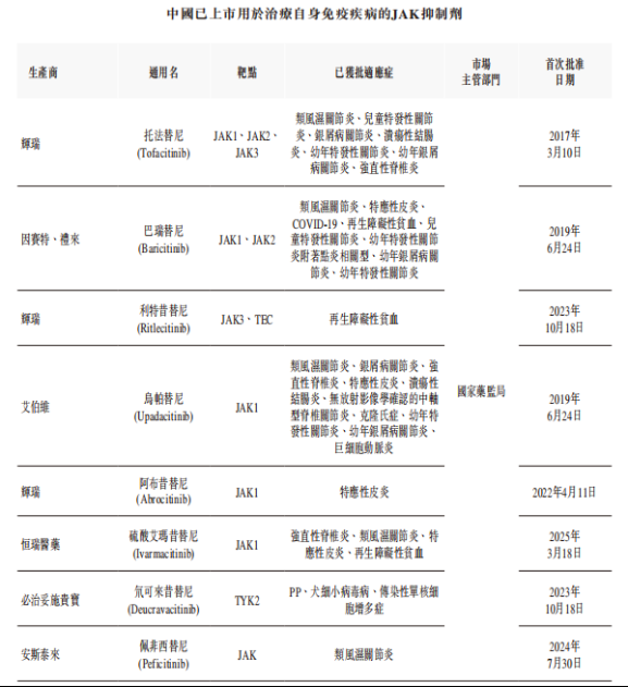 巨大的临床需求与商业前景,这一赛道竞争也十分激烈。2019年,LNK01001启动临床前研究,彼时中国市场上仅有辉瑞的第一代JAK抑制剂托法替尼上市。随后几年,JAK抑制剂加速上市。截至招股书披露日,中国已上市用于治疗自身免疫疾病的JAK抑制剂扩充至8款,全球已有10款JAK抑制剂获批上市。