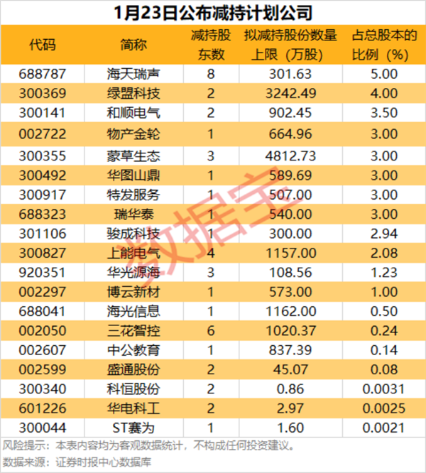 1月23日,19家公司发布了股东减持计划,拟减持比例居前的有海天瑞声、绿盟科技、和顺电气等,拟减持比例分别为5%、4%、3.5%。