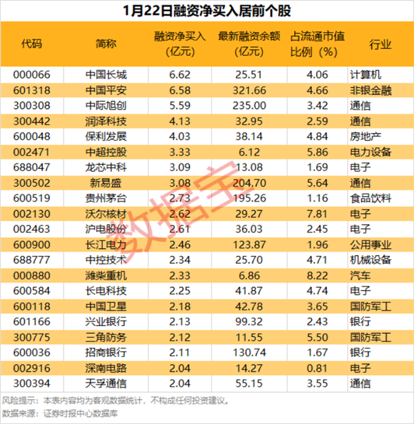 具体到个股,1月22日共有1756只股获融资净买入,净买入金额1亿元以上的有53只,其中,8只融资净买入额均超3亿元。中国长城融资净买入额居首,当日净买入6.62亿元,其次是中国平安、中际旭创,融资净买入金额分别为6.58亿元、5.59亿元,融资净买入金额居前的还有润泽科技、保利发展、中超控股等。