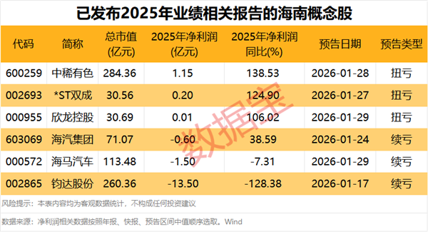 截至1月29日,6只海南概念股已发布2025年业绩相关报告。中稀有色、*ST双成、欣龙控股3股预计扭亏;海汽集团、海马汽车、钧达股份3股预计续亏。