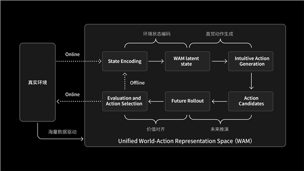 通过反事实推演(Counterfactual Reasoning),模型能基于直觉快速并行生成多组动作候选,并提前预判物理后果。这种机制相当于在行动前完成了亿万次虚拟试错,让机器人即便在突发状况下,也能凭借“经验直觉”生成最优解,实现 Drive 与 Work 的无缝耦合及实时响应。