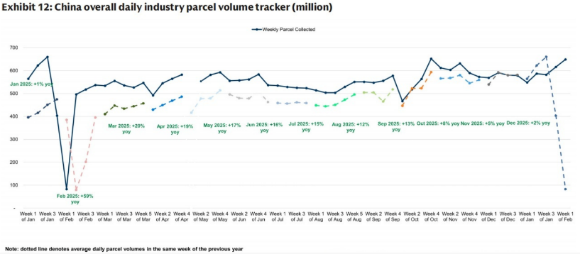 并提及,这些电商相关税收政策的落地,叠加“反内卷”背景下快递配送价格的上涨,已导致直播电商增速放缓,低价小件包裹的占比有所下降。并强调:这一点从去年Q4行业包裹量增速放缓中可见端倪。