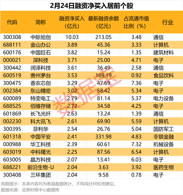 中际旭创融资净买入额居首,当日净买入10.03亿元;其次是金山办公、中国巨石,融资净买入金额分别为3.89亿元、3.82亿元;融资净买入金额居前的还有深科技、润泽科技、贵州茅台等。