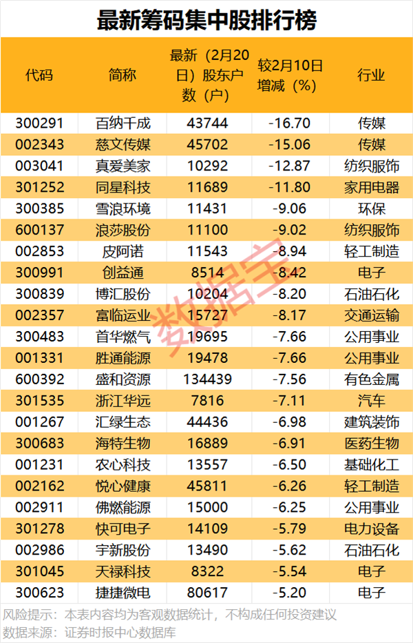 股东户数降幅最多的是百纳千成,截至2月20日最新股东户数为43744户,较2月10日环比下降16.70%;其次是慈文传媒,最新股东户数为45702户,环比下降15.06%;股东户数降幅超10%的还有真爱美家、同星科技。