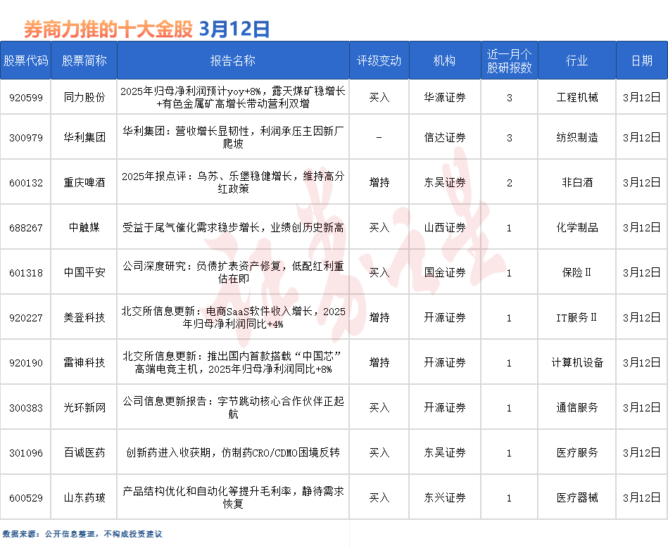 同力股份最受券商关注,近一个月获开源证券、东吴证券等3份券商研报关注,位居3月12日券商力推股榜首。