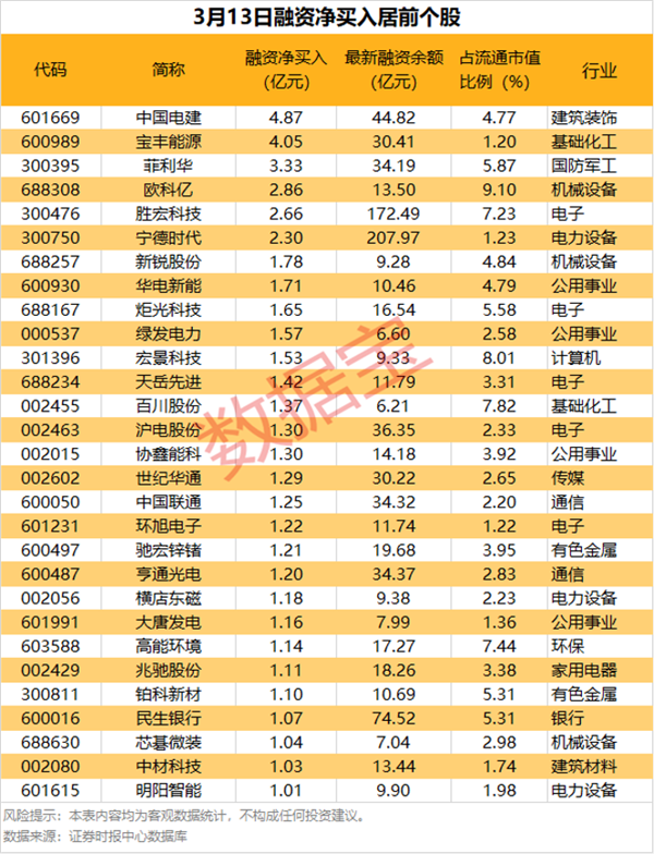 中国电建融资净买入额居首,当日净买入4.87亿元;其次是宝丰能源、菲利华,融资净买入金额分别为4.05亿元、3.33亿元。融资净买入金额居前的还有欧科亿、胜宏科技、宁德时代等。