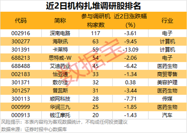 最受关注的是深南电路,有117家机构调研;其次是海联讯、卡莱特,均有超50家机构调研。