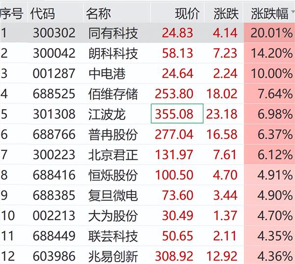 另外,存储器指数盘中拉升走强。同有科技走出20cm涨停,中电港涨停,朗科科技、普冉股份、佰维存储、江波龙等纷纷大涨。