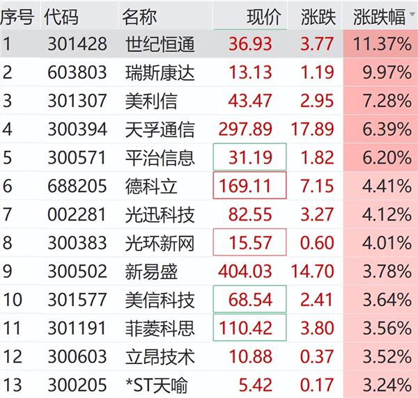个股方面,世纪恒通涨超10%,瑞斯康达涨停,天孚通信、德科立、光迅科技、新易盛等均有明显涨幅。