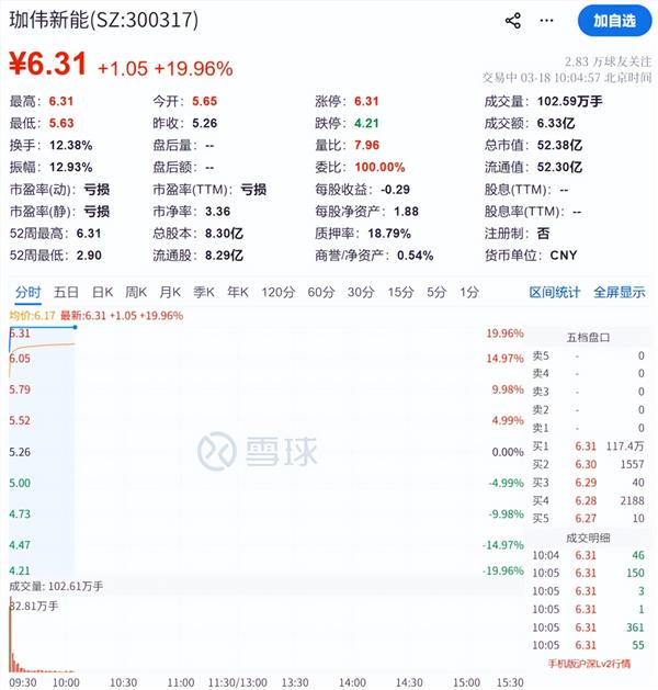 珈伟新能开盘1分钟走出20cm涨停,报6.31元/股。