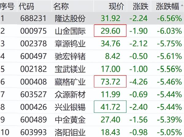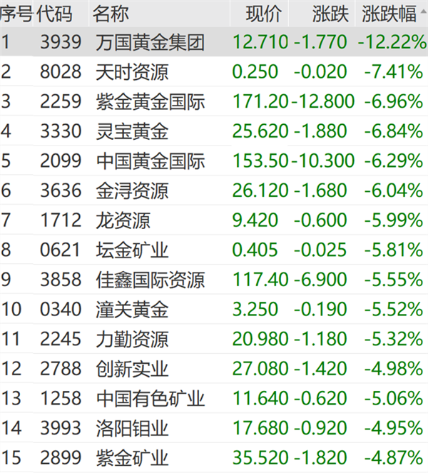 个股方面,山金国际、藏格矿业、中金黄金、洛阳钼业等大市值个股均有明显跌幅。