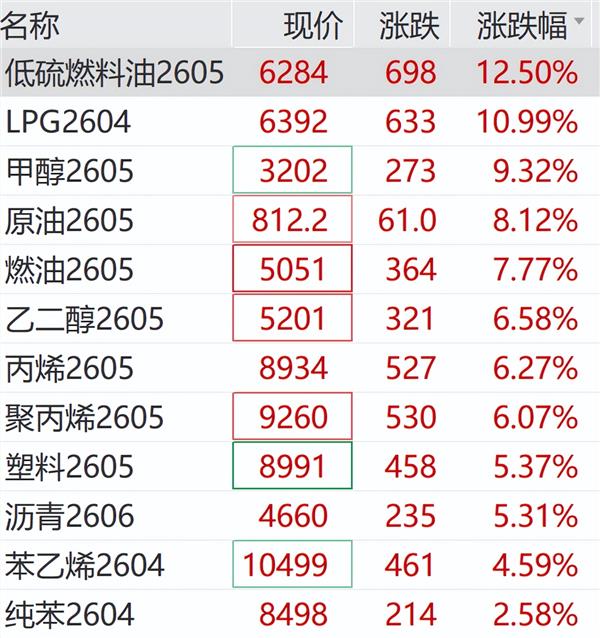 3月19日,美油、布油继续走高,布油一度突破107美元/桶。国内期货市场方面,低硫燃料油、LPG、甲醇、燃油、原油、乙二醇等相关品种纷纷大涨。