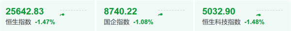 港股三大指数集体低开,恒生指数跌1.82%,恒生科技指数跌2.1%,恒生国企指数跌1.62%。截至发稿,三大指数跌幅有所收窄,但仍超1%。