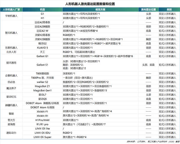 人形机器人3D激光雷达单机搭载量在1-2颗,人机协作场景单机搭载量有望进一步提升。人形机器人目前的形态有双足和轮式两种。在3D激光雷达的配置上,双足人形机器人一般安装在头部、颈部或胸部位置,数量一般为1颗,如宇树科技明星产品G1在头部标配了1颗3D激光雷达;轮式人形机器人一般安装在底盘位置,数量为1-2颗,如智元精灵G2在底盘处搭载2颗激光雷达。