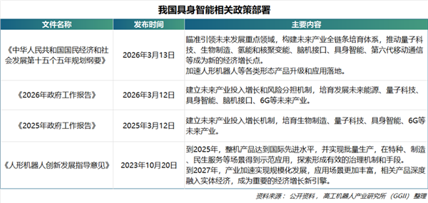 具身智能已成为全球科技竞争与产业布局的核心方向,我国将其上升为国家战略。2023年10月,我国工信部发布《人形机器人创新发展指导意见》,开篇点出“人形机器人集成人工智能、高端制造、新材料等先进技术,有望成为继计算机、智能手机、新能源汽车后的颠覆性产品,将深刻变革人类生产生活方式,重塑全球产业发展格局。”并提出2025年实现人形机器人批量生产、2027年规模化发展的目标。2025年,具身智能首次被写入中国政府工作报告,2026年,再次被明确部署,并被纳入“十五五”规划前瞻布局,培育发展具身智能已正式上升为国家未来产业核心战略,与量子科技、脑机接口、6G等并列成为新质生产力关键增长引擎。