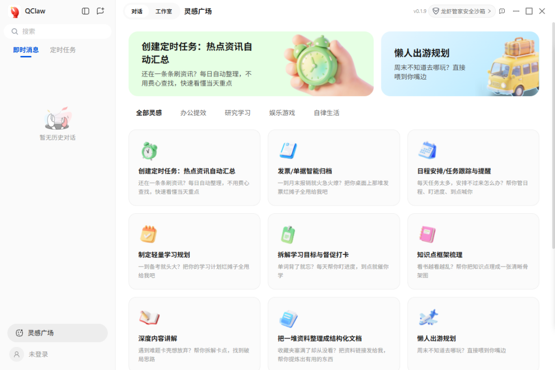 QClaw内置的“灵感广场”,预置了远超ArkClaw的常用任务与技能模块,从个性化学习计划制定、日常日程安排,到发票单据智能归档、办公文档整理、内容创作等,全面满足用户办公提效、研究学习、休闲娱乐等多元化需求,进一步强化了微信生态内的AI使用粘性。