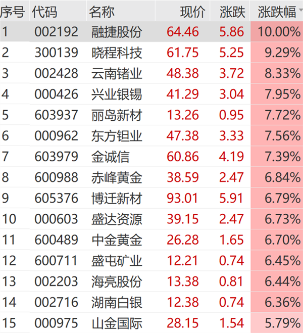 个股方面,融捷股份涨停,晓程科技、兴业银锡、赤峰黄金、盛达资源、中金黄金等纷纷大涨。