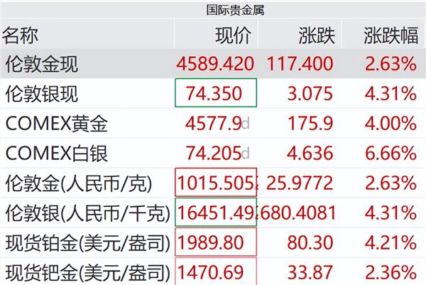 3月25日上午,国际贵金属现货、期货价格持续走强。截至发稿,现货黄金涨超2.5%,现货白银涨超4%;COMEX黄金涨4%,白银涨超6%;铂金、钯金亦有明显涨幅。
