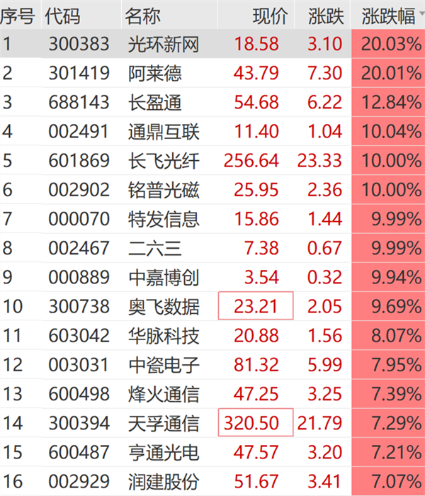 个股方面,铭普光磁竞价涨停,阿莱德20cm涨停,通鼎互联、中嘉博创、二六三、特发信息等纷纷涨停。