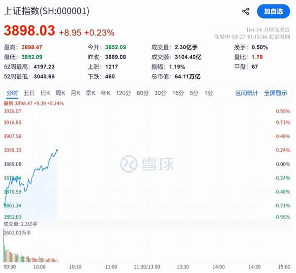3月27日,A股市场开盘走低,上证指数跌0.95%,深证成指、创业板指、科创综指等跌超1%。随后,市场震荡上行。截至发稿,上证指数、深证成指、科创综指纷纷翻红,全市场超4100只个股上涨。