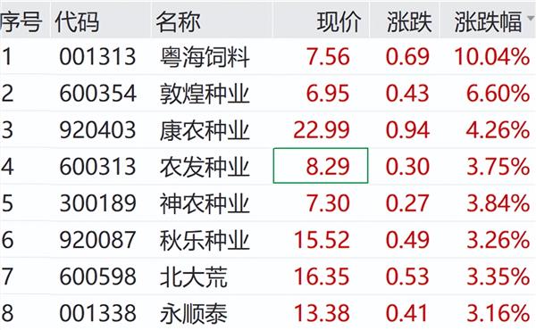与此同时,上午农业股同步走强,粤海饲料冲高涨停,敦煌种业、北大荒等涨幅居前。