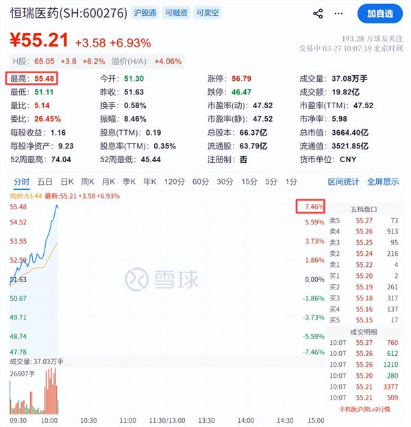 恒瑞医药直线拉升,大涨近7%。