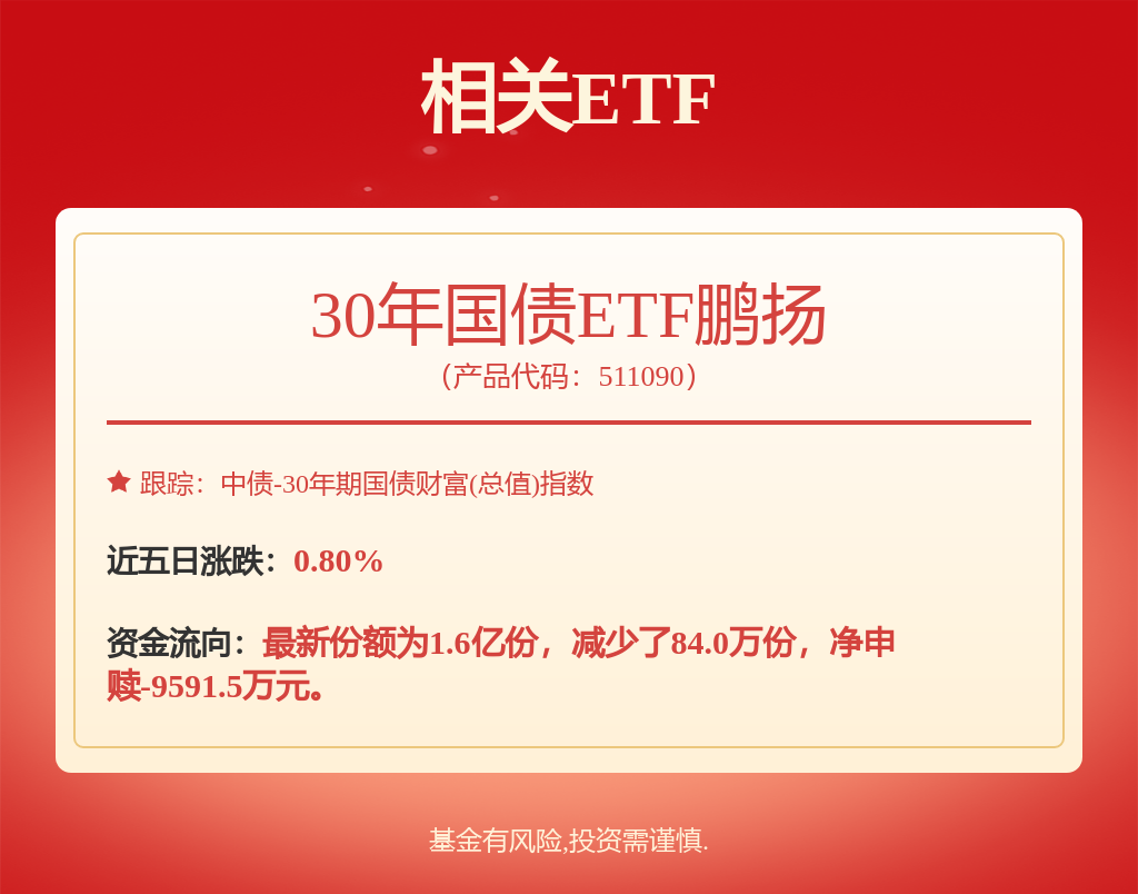 风险提示:中债-30年期国债财富(总值)指数(代码:CBA21801.CS)来源于中债金融估值中心有限公司(“中债”)。本基金为被动投资的交易型开放式指数基金,主要采用抽样复制策略,跟踪标的指数市场表现,具有与标的指数所表征的市场相似的风险收益特征。投资者投资于本基金面临标的指数回报与相应市场平均回报偏离、标的指数波动、跟踪误差控制未达约定目标、标的指数变更、指数编制机构停止服务、成份券停牌或违约等潜在风险。