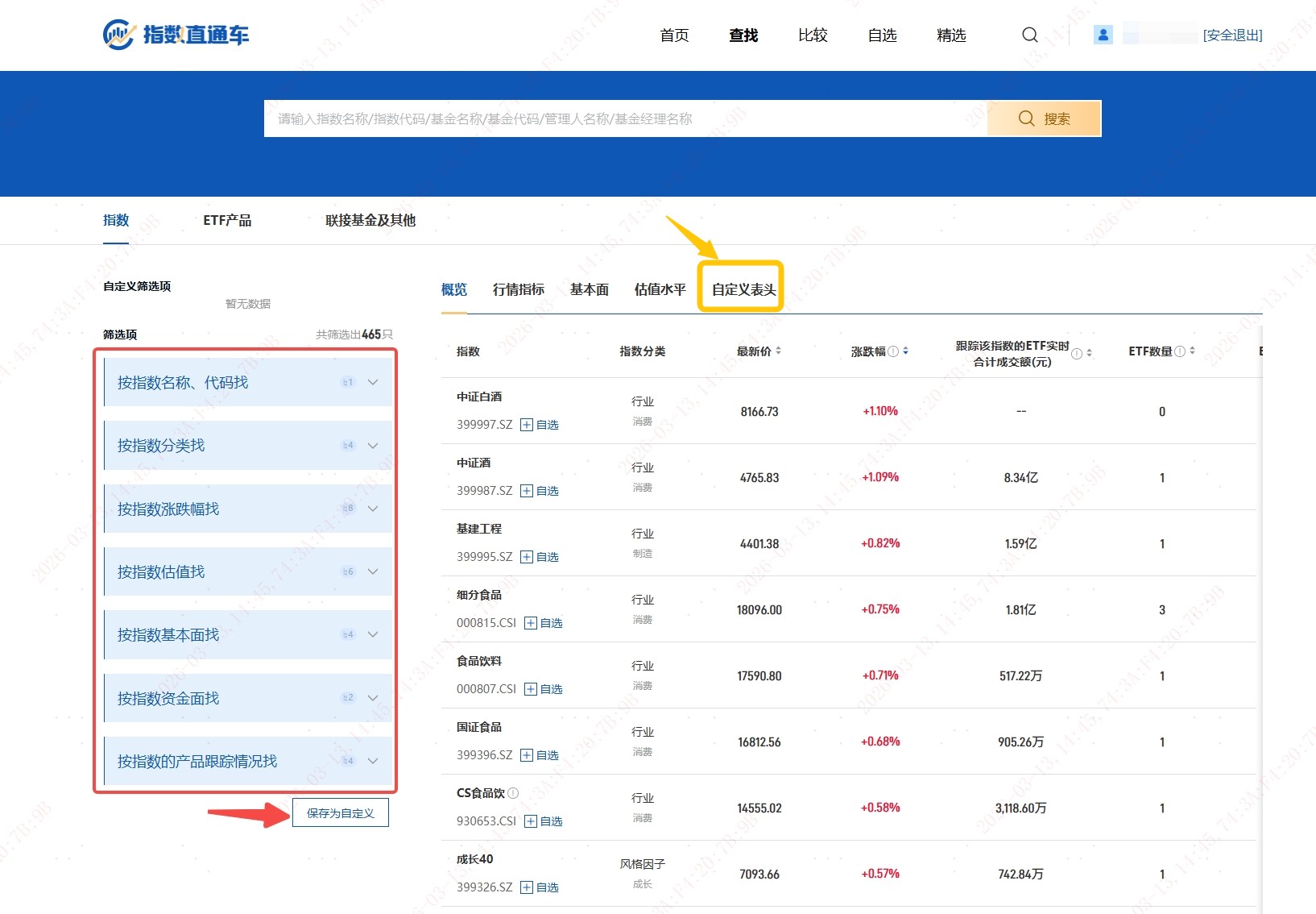 在“查找”栏目下的“指数”、“ETF产品”、“联接基金及其他”三大核心板块,网页端进一步强化了筛选与检索能力。投资者可在页面左侧灵活设置多维筛选条件,并保存个性化配置;列表区域则支持“自定义表头”,用户可根据自身关注重点勾选指标组合,实现更加精准、高效的数据展示,提升信息获取效率。
