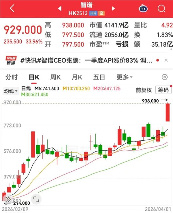 两只国产大模型股票股价暴涨。其中,MINIMAX-W盘中大涨超17%,重回1000港元上方;智谱一度暴涨超35%,触及938港元,创出历史新高,市值一度突破4000亿港元。