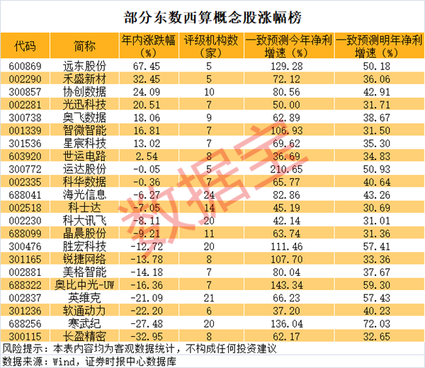 从股价表现来看,远东股份年内大涨超67%居首,主要受益于光纤价格上涨所致。另外,禾盛新材、协创数据等个股均涨超20%。跌幅较大的个股主要有长盈精密、寒武纪、软通动力等。