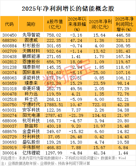 从业绩数据来看,据证券时报·数据宝统计,按照2025年年报、业绩快报、预告净利润下限(若无下限则取公告数值)计算,2025年净利润同比增长(含扭亏为盈)的储能概念股有23只。4股净利润扭亏为盈,分别为恩捷股份、杉杉股份、鹏辉能源、固德威。