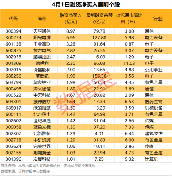 具体到个股,4月1日共有1838只股获融资净买入,净买入金额在千万元以上的有439只,其中21只融资净买入额超1亿元。天孚通信融资净买入额居首,当日净买入8.97亿元;其次是阳光电源、工业富联,融资净买入金额分别为6.96亿元、3.28亿元;融资净买入金额居前的还有东方电气、鹏鼎控股、德明利等。