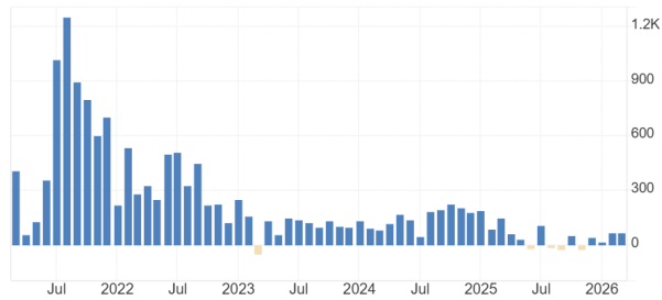 历史数据看,ADP的历史峰值出现在2021年8月份,至今的四年多时间,整体保持下降趋势。2025年曾有四次,ADP数据跌入负值,2026年尚未出现这种情况。2025年是美国总统特朗普对非法移民打击力度最强的一年,劳动力市场遭受显著冲击,某些月份出现就业人数负值可以理解。2026年,因为预算问题,特朗普已经大幅压缩了ICE的权限。尤其是对于酒店、消费、机场等敏感场所,不再进行公开抓捕。这在一定程度上缓和了劳动力市场的紧张局势,所以今年的ADP数据大概率会整体优于2025年。