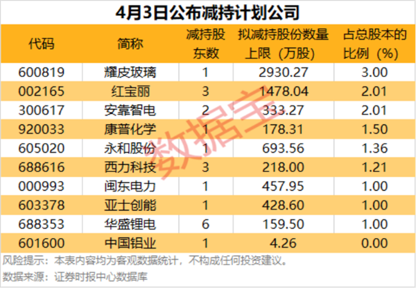 今日共10家公司公告减持计划,拟减持比例居前的有耀皮玻璃、红宝丽、安靠智电等。从市场表现看,拟减持比例居前的这3只股票今日早盘均跌超5%。